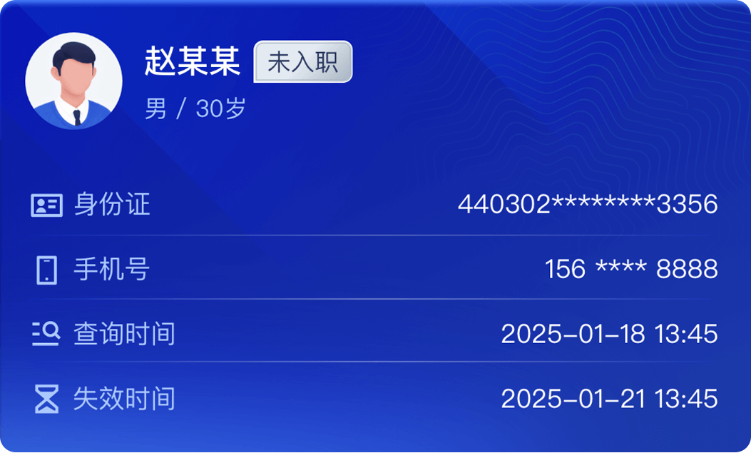 候选人仅需人脸识别授权,无需提供繁琐证明,3秒完成,配合度提升80%,验证过程高效便捷。