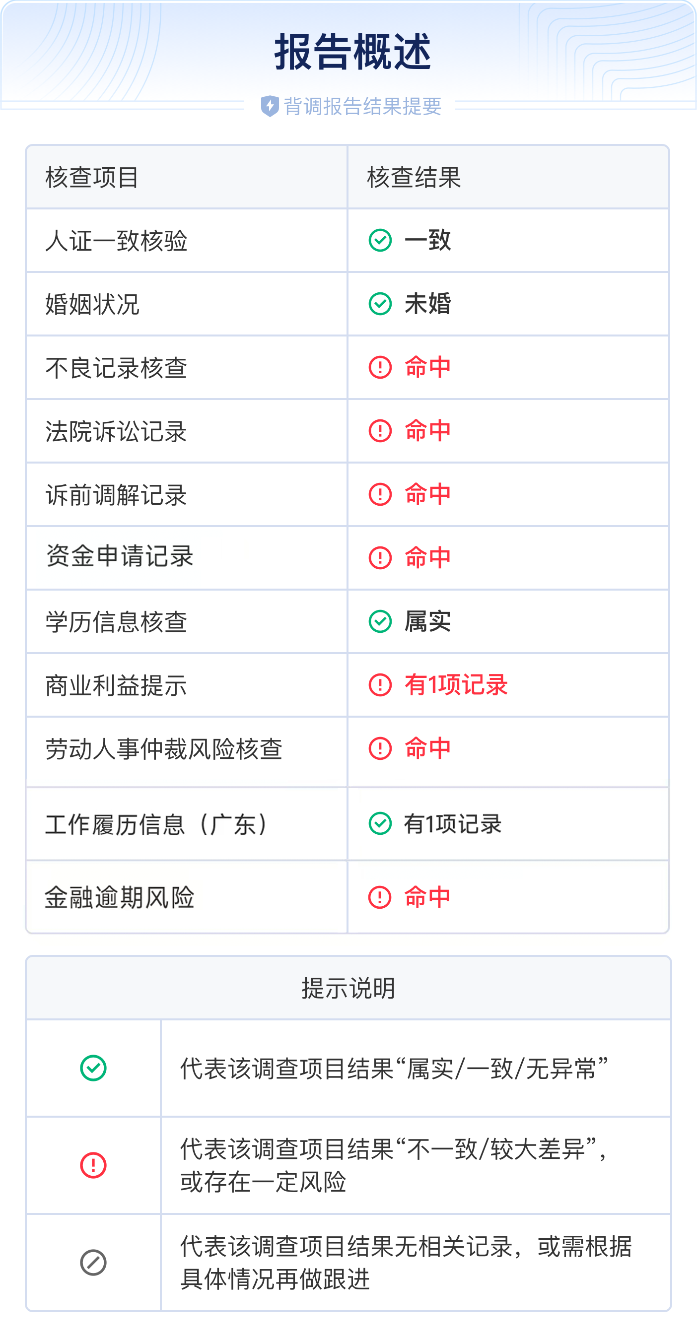 我们的背调报告包含身份信息验证、学历学位验证、工作履历核实等客观信息。根据套餐不同,还可能包含不良记录查询、金融违规记录查询等内容。所有报告仅包含可验证的客观事实。